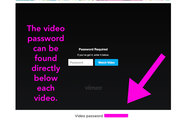 1 Video Password – The video password can be found directly below each video. This password is used by everyone in the workshop. It is different from your unique password you use to log in to the workshop.